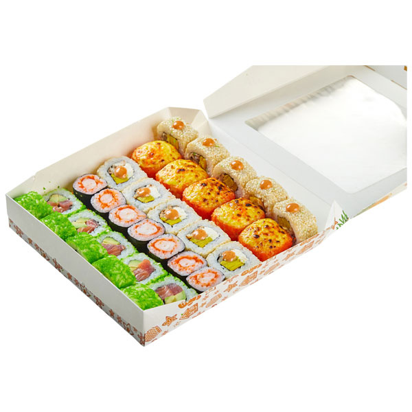 Лосось, угорь, снежный краб, окунь, масаго, бекон, крем-сыр, сыр гауда, огурец, дайкон, авокадо, панко, кунжут