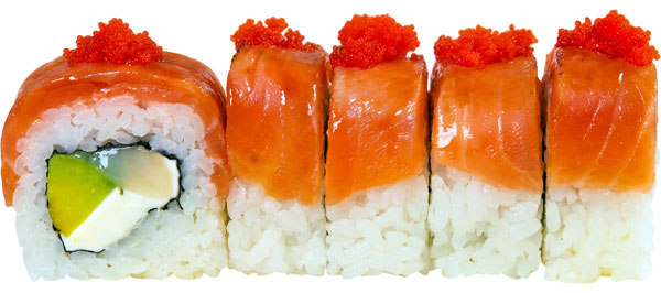 Лосось, гребешок, крем-сыр, авокадо, икра масаго, соус терияки