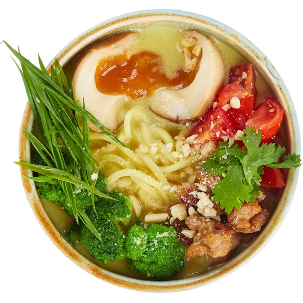 Насыщенный свино-говяжий бульон с кокосовым молоком, яичная лапша, курица, маринованное яйцо, зеленый лук, черри, брокколи, кинза, арахис