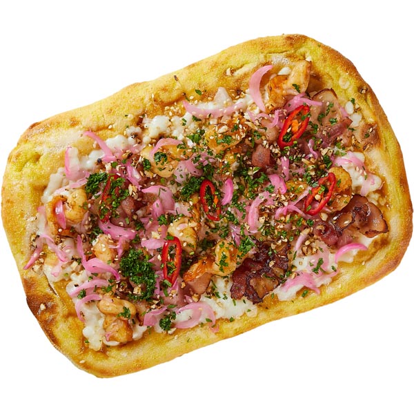 Креветки тигровые, бекон, моцарелла, мисо соус, лук маринованный, арахис, кинза, соус терияки, перец чили, кунжут